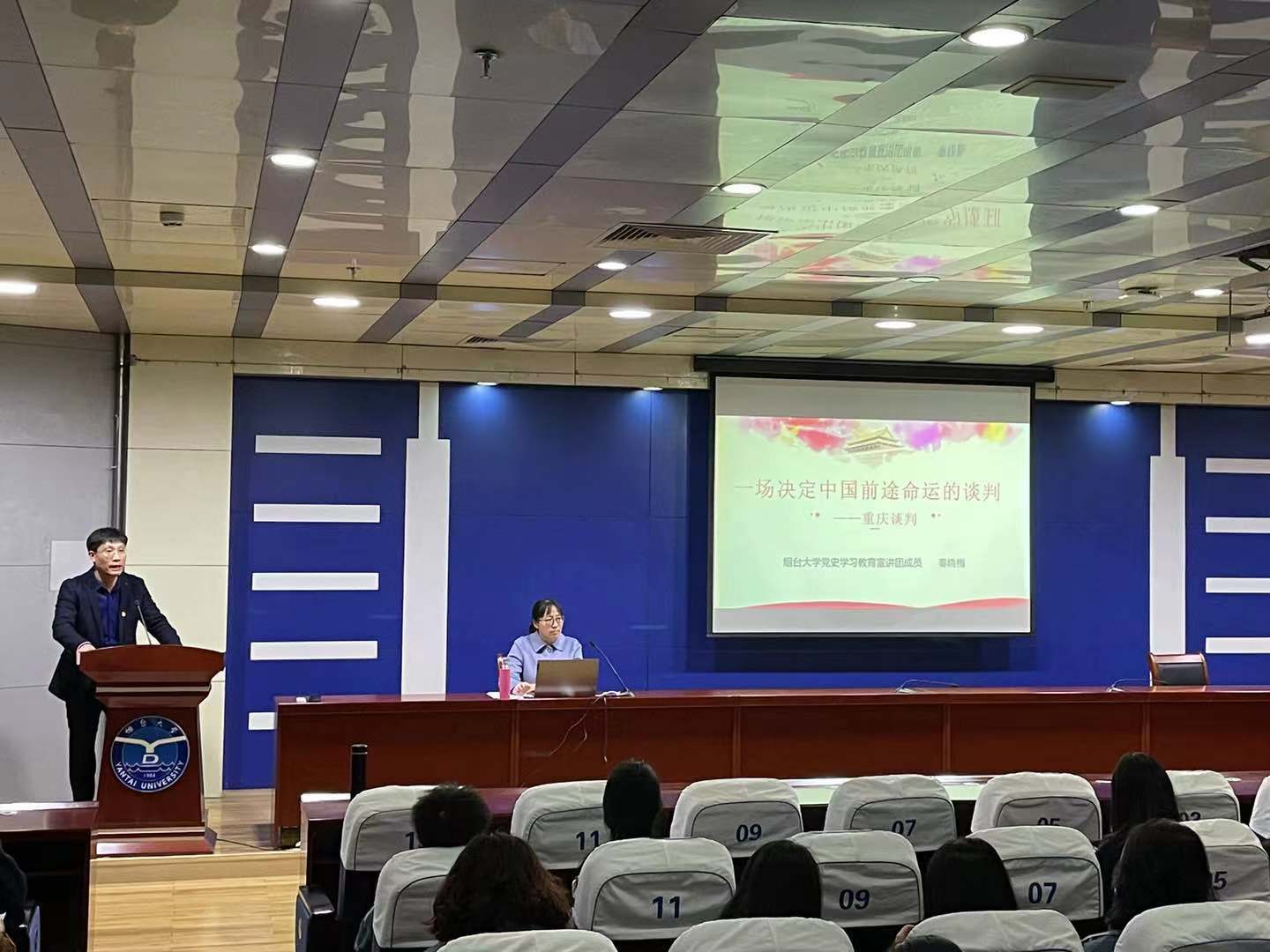 当日下午,药学院教工党支部、研究生党支部、本科生党支部与学校图书馆第一、第二党支部开展校内共学活动,共同邀请了烟台大学党史学习教育宣讲团秦晓梅老师做题为“一场决定中国前途命运的谈判——重庆谈判”的报告,药学院党总支副书记张立明主持了报告会。下一步,双方党组织将继续以共学共建提升党史学习教育的实效,真正做到学党史、悟思想、办实事、开新局。