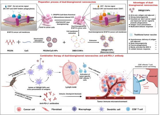 近日,我校药学院陈大全教授团队联合中科院长春应化所、厦门大学田华雨研究员团队在国际期刊《Bioactive Materials》(IF:16.874)上发表以“CD47KO/CRT dual-bioengineered cell membrane-coated nanovaccine combined with anti-PD-L1 antibody for boosting tumor immunotherapy”为题的研究论文(DOI:10.1016/j.bioactmat.2022.09.017)。本研究设计了一种双重生物工程化的肿瘤疫苗,增强了肿瘤抗原的免疫原性,在联合免疫检查点抑制剂后,有效抑制了肿瘤的生长,为个性化肿瘤疫苗的开发提供了新思路。