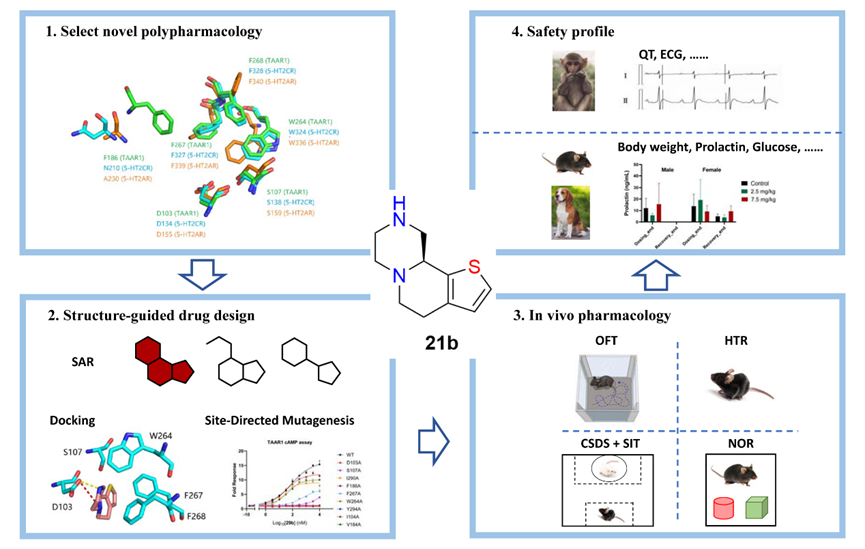 近日,烟台大学药学院/分子药理和药物评价教育部重点实验室田京伟/张剑钊/芦静团队与绿叶制药集团创新研究院,首次发现微量胺相关受体1 (Trace-amine associated receptor 1, TAAR1)和5-HT2C受体(5-hydroxytryptamine receptor 2C, 5-HT2CR)的相似结合模式,用于新一代治疗精分药物/阿尔茨海默病精神病性障碍等疾病研发。芦静带领药物设计团队基于人工智能药物设计和计算机辅助药物设计(AIDD/CADD)获得全球首个双靶点激动剂,表现出对TAAR1和5-HT2CR高特异性的强激动活性,在多种药效学模型展现出显著优于目前临床用药的特征;已在中国和美国进入临床I期多剂量递增(MAD)研究阶段,临床前和初步临床结果显示耐受性和安全性良好,未出现抗精分药物常见的锥体外系不良反应、血脂代谢异常、体重增加等副作用,被行业列为具有“重磅炸弹”潜力的分子。这一重要的科研成果不仅为精神分裂症和阿尔茨海默病精神病性障碍等患者提供了新的治疗选择,也为未来药物研发提供了创新策略。