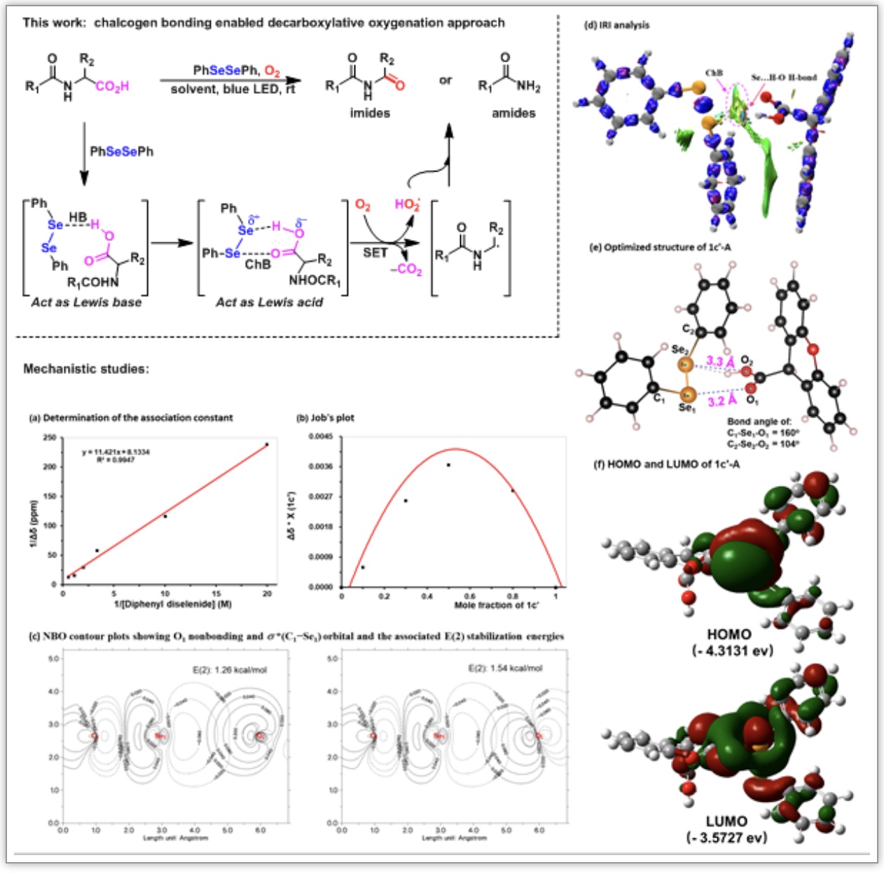 本研究提出利用反向催化策略,即路易斯碱性的二苯基二硒醚作为路易斯酸催化剂活化羧酸的催化模式,在光照和有氧条件下,成功实现多肽分子的选择性C-末端酰胺/酰亚胺修饰。该催化策略不仅实现了脱羧氧化反应由过渡金属催化到主族元素的弱相互作用催化的模式转变,而且实现传统途径无法完成的反应。